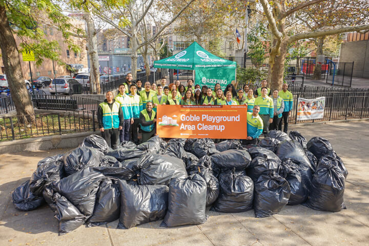 Before the winter sets in, volunteers with ASEZ WAO gathered for one more cleanup effort in the Bronx. Working in partnership with Assemblywoman Latoya Joyner, 35 volunteers cleaned up Goble Playground. In total, 70 bags of leaves and garbage were collected and prepared for pickup by the NYC Dept. of Sanitation.