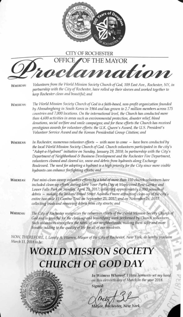 Furthermore, the Church of God received special recognition from Mayor Lovely Warren, who is also the Director of Neighborhood Service Centers. On behalf of the city of Rochester, Lovely Warren declared March 11, 2018 to be World Mission Society Church of God Day, in honor of the members’ volunteer efforts. Read about the Church of God in the local news.